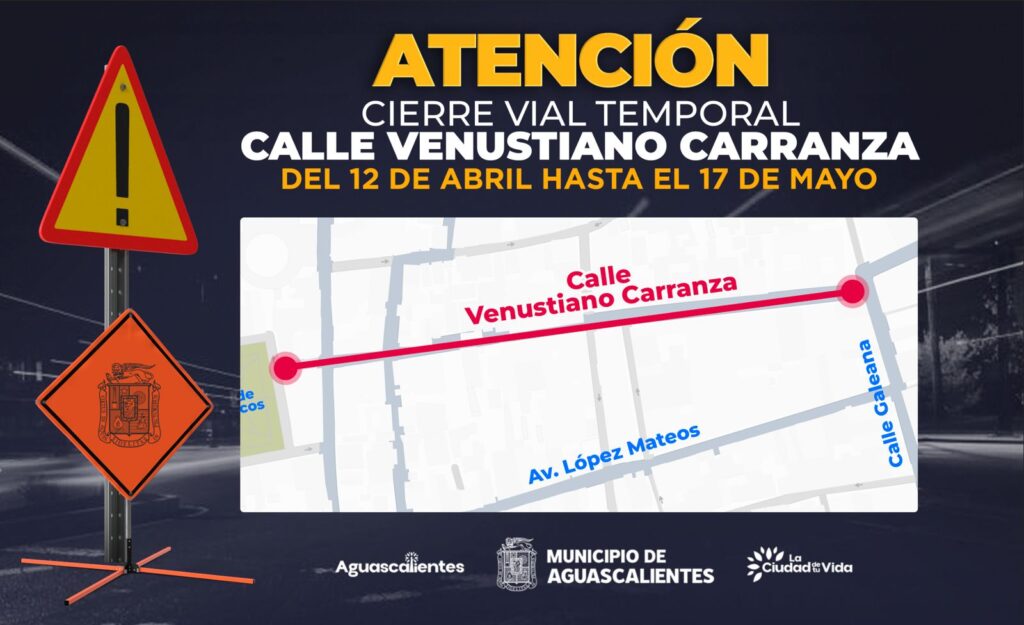 La Secretaría de Seguridad Pública Municipal (SSPM), a través de la Dirección de Movilidad, anunció el cierre al tránsito vehicular de la calle Venustiano Carranza, con motivo de las actividades de la Feria Nacional de San Marcos 2025.