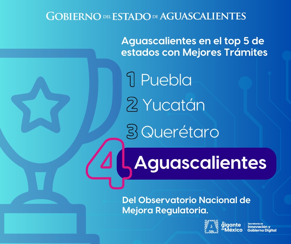 Ramiro Pedroza Márquez, titular de la Secretaría de Innovación y Gobierno Digital (Sigod), informó que al inicio de la actual administración estatal, Aguascalientes se ubicaba en el lugar 22 a nivel nacional en el Indicador de Avance de la Estrategia Nacional de Mejora Regulatoria (IENMR). Gracias a acciones como la simplificación y digitalización de trámites, así como a la implementación del Expediente Digital, el estado logró avanzar 18 posiciones en dicha evaluación.