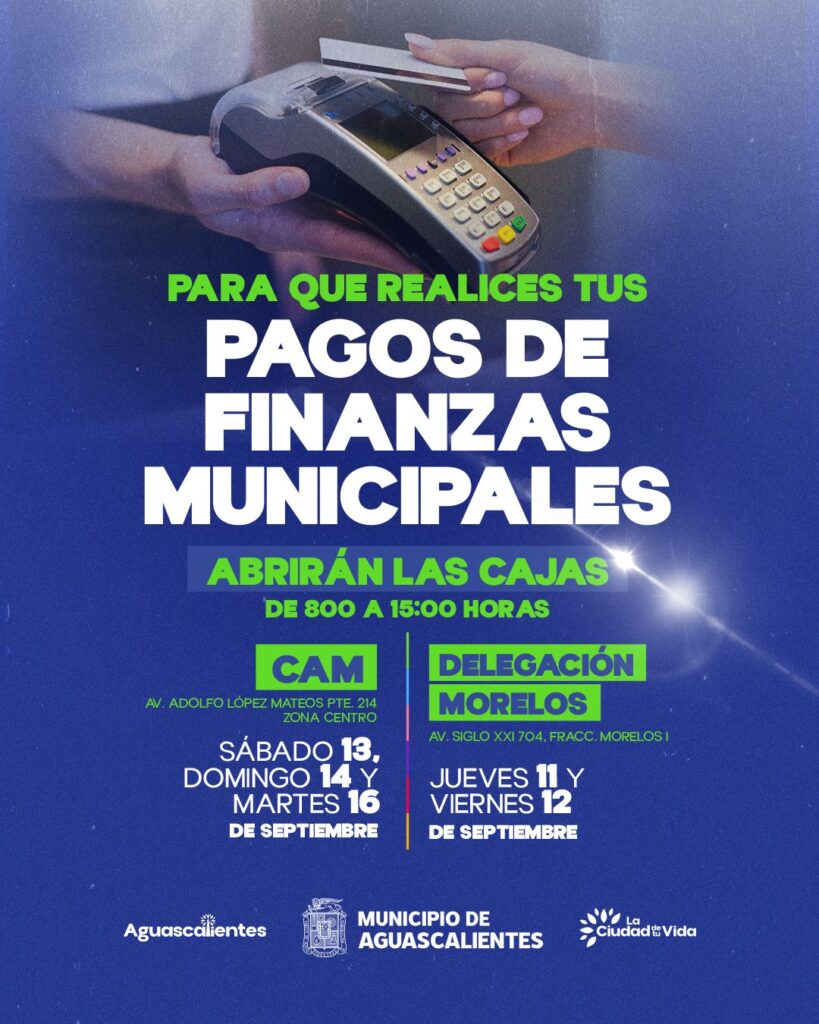 Con el objetivo de ofrecer a la ciudadanía más opciones para el pago de las obligaciones municipales, la Secretaría de Finanzas dio a conocer que de forma extraordinaria se abrirán las cajas en el Centro de Atención Municipal (CAM), ubicado en la Av. Adolfo López Mateos No. 214, Zona Centro, los días sábado 13, domingo 14 y martes 16 de septiembre, en un horario de 08:00 a 15:00 horas y en la Delegación Morelos, ubicada en la Av. Siglo XXI No. 704, Fraccionamiento Morelos I, los días 11 y 12 de septiembre, en un horario de 08:00 a 15:00 horas.