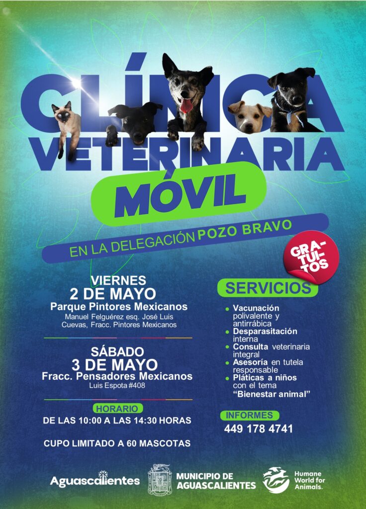 El Municipio de Aguascalientes, a través de la Coordinación General de Delegaciones Urbanas y Rurales dio a conocer que para este mes de mayo, las jornadas de la Clínica Veterinaria Móvil se llevarán a cabo en fraccionamientos y colonias de la delegación Pozo Bravo.