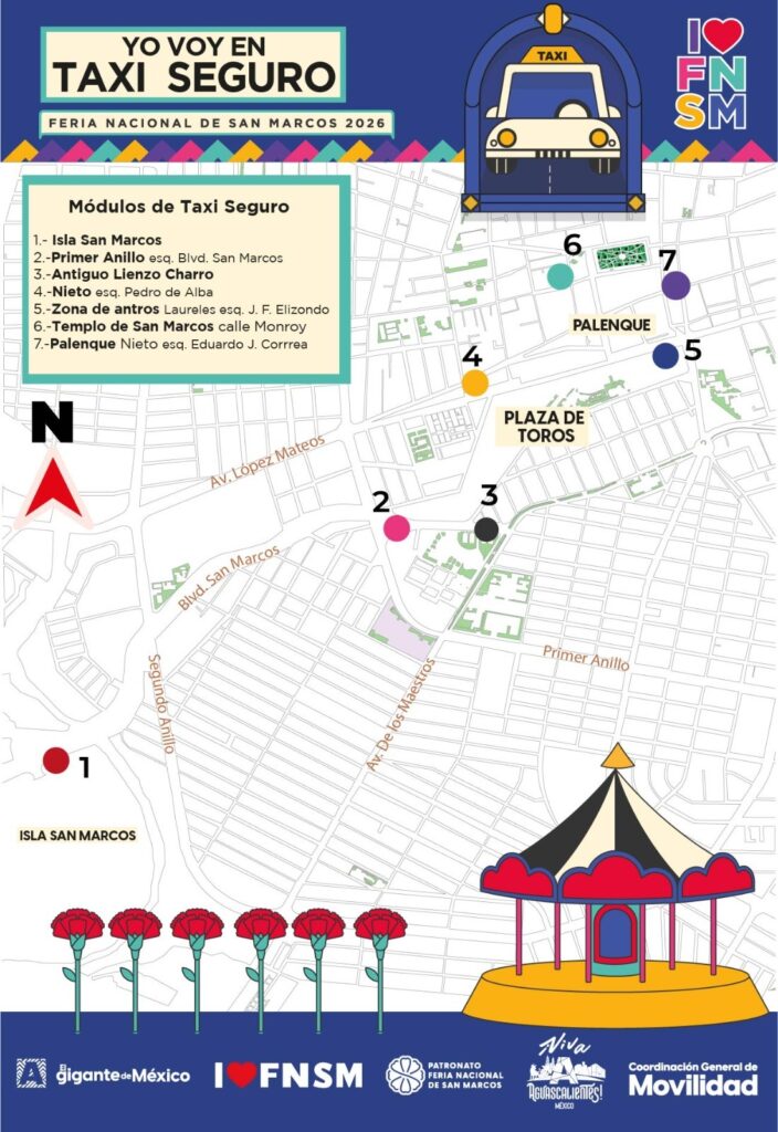 De igual forma, se puso en marcha el programa Taxi Seguro, con el propósito de facilitar el regreso de las y los visitantes a sus hoteles o domicilios. Para ello, se instalaron siete puntos dentro del perímetro ferial, donde se puede solicitar el servicio con tarifas previamente establecidas; cabe destacar que todos los traslados quedarán registrados en los módulos, lo que brinda mayor seguridad a las y los usuarios.