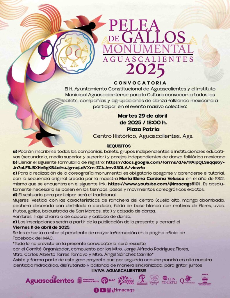 El Instituto Municipal Aguascalentense para la Cultura (IMAC) convoca a todos los ballets, compañías y agrupaciones de danza folklórica mexicana a ser parte de la “Pelea de Gallos Monumental Aguascalientes 2025”, un evento que, por segundo año consecutivo reunirá a miles de bailarines en una presentación colectiva llena de tradición, energía y pasión por la danza.