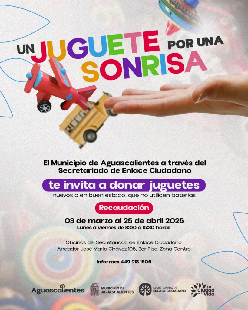 La recaudación de juguetes se realizará a partir del día 3 de marzo al 25 de abril de 2025, y se estarán recibiendo donaciones en la oficina del Secretariado de Enlace Ciudadano, ubicada en Andador José María Chávez #105, tercer piso, Zona Centro, Tel. 449 918 1506.