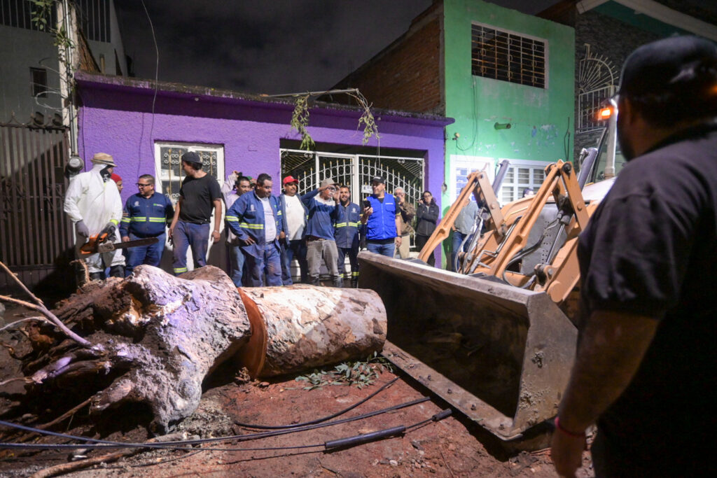 En esta zona, personal de la Coordinación General de Delegaciones, Servicios Públicos y Protección Civil trabajaron de manera conjunta para retirar los árboles colapsados, cuyas raíces cedieron ante el reblandecimiento del suelo y la fuerza del viento.