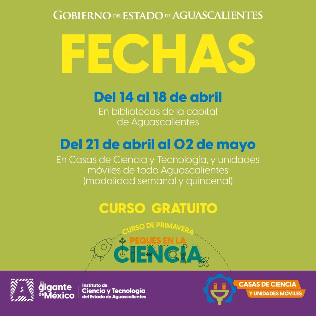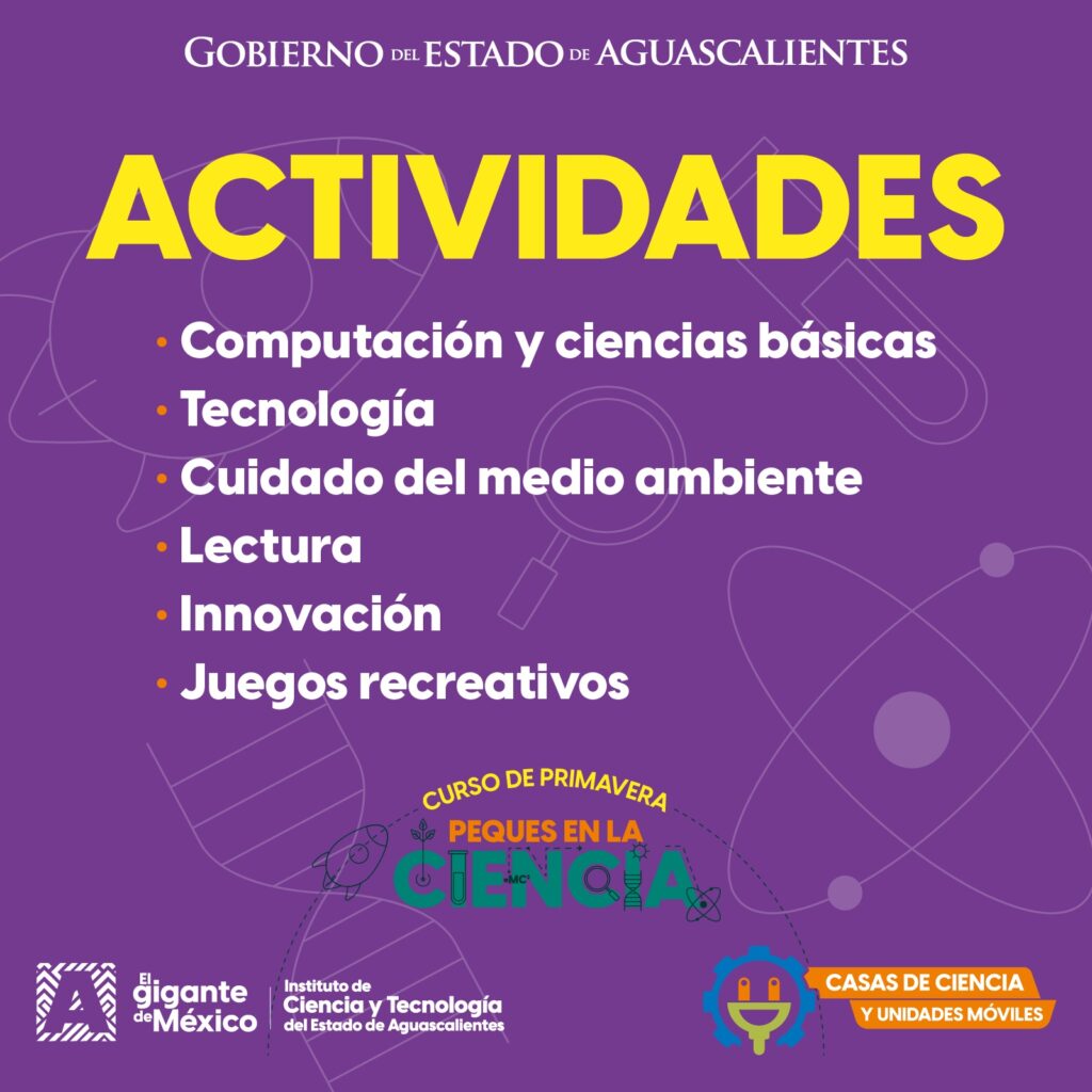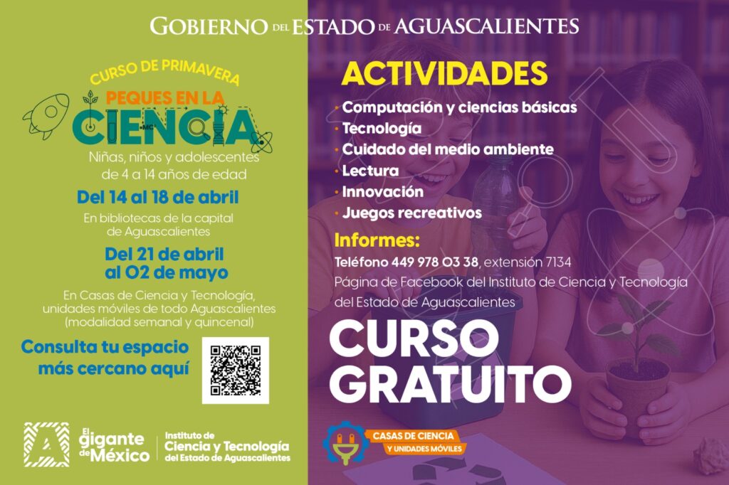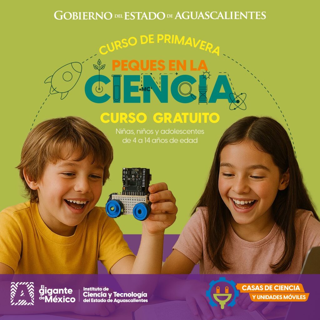 Estas vacaciones, niñas, niños y adolescentes de 4 a 14 años de todos los municipios de Aguascalientes podrán disfrutar totalmente gratis del curso de primavera “Peques en la Ciencia”; esta iniciativa que impulsa la gobernadora Tere Jiménez busca acercar la ciencia y la tecnología a todos los rincones de Aguascalientes.