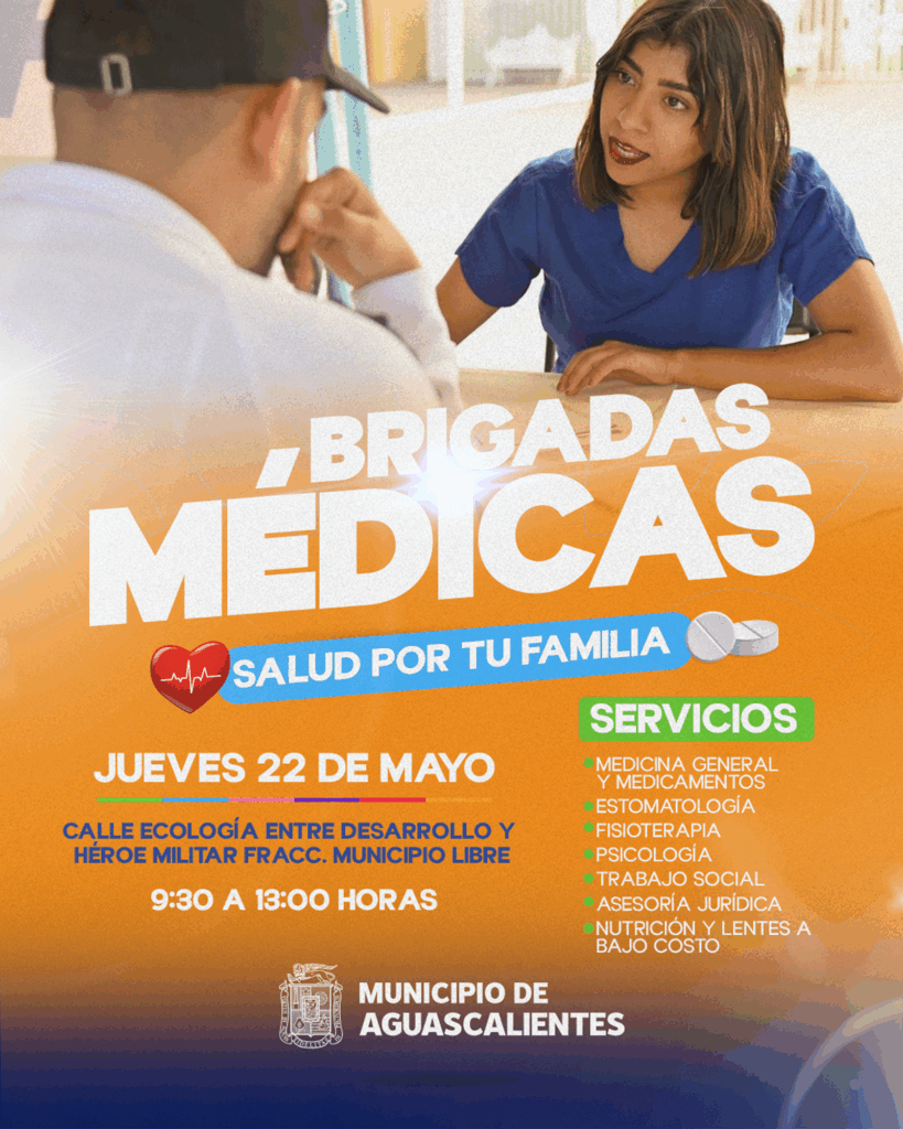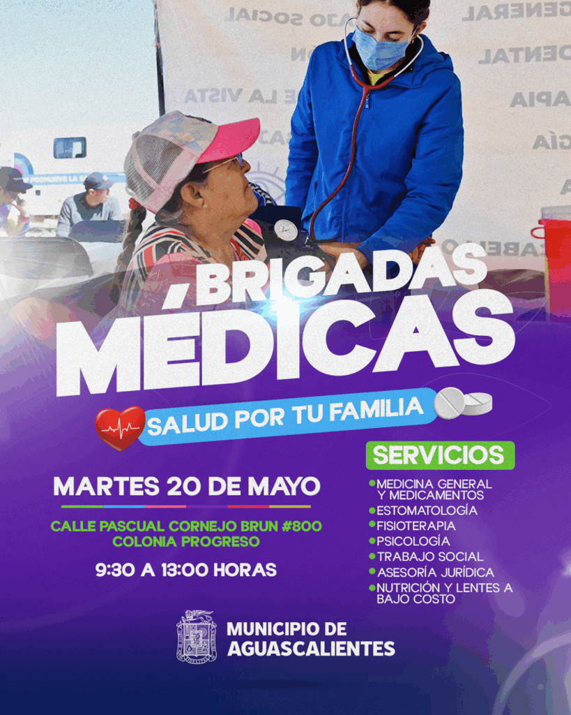 Con el propósito de acercar servicios médicos de salud a las diferentes colonias y fraccionamientos de la ciudad capital, el Municipio de Aguascalientes a través del DIF Municipal realizará brigadas médicas gratuitas en la colonia Progreso y el fraccionamiento Municipio Libre, este martes 20 y jueves 22 de mayo, respectivamente, de 9:30 de la mañana a 1:30 de la tarde.