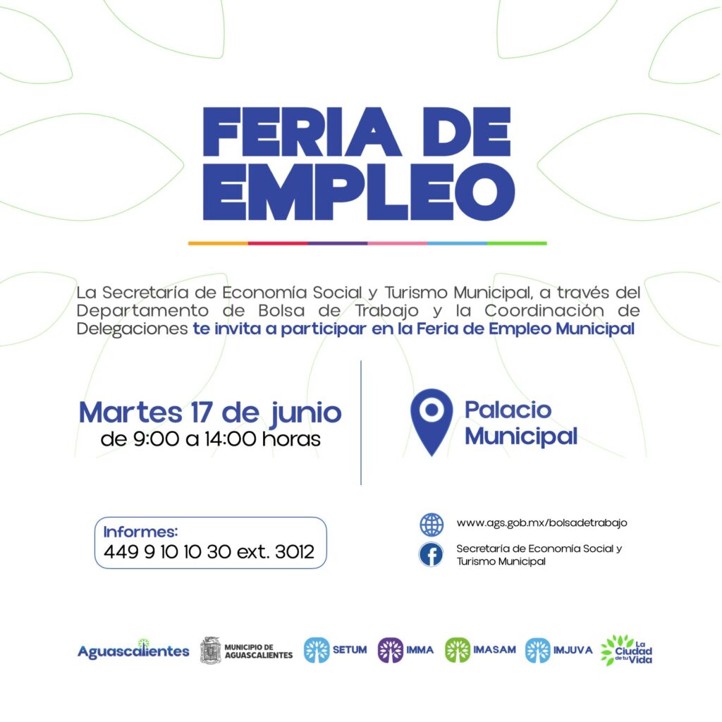 El Municipio de Aguascalientes, a través de la Secretaría de Economía Social y Turismo Municipal, invita a la ciudadanía a participar en la Feria del Empleo Municipal, un espacio que busca acercar a las y los buscadores de empleo con empresas locales que requieren talento para integrarse a sus equipos de trabajo. Esta jornada se realizará el próximo martes 17 de junio de 2025, en el Palacio Municipal, de 9:00 a 14:00 horas.