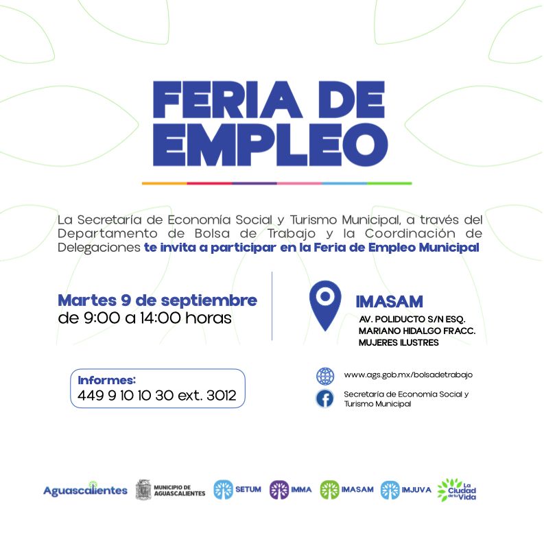 El Municipio de Aguascalientes, a través de la Secretaría de Economía Social y Turismo Municipal (SETUM), invita a las y los ciudadanos a participar en la próxima Feria de Empleo Municipal, que se llevará a cabo el martes 9 de septiembre de 2025, de 9:00 a 14:00 horas, en las instalaciones del Instituto Municipal de Salud Mental (IMASAM), ubicado en Av. Poliducto s/n esquina con Mariano Hidalgo, Fraccionamiento Mujeres Ilustres.