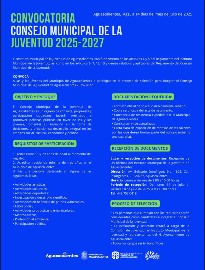 Para mayores informes, comunicarse al teléfono 449 752 0419. Las personas que cumplan con los requisitos establecidos serán consideradas candidatas para integrar el Consejo Municipal de la Juventud. La evaluación y selección estará a cargo de la Comisión de Juventud, el Instituto Municipal de la Juventud y representantes del Honorable Ayuntamiento de Aguascalientes. Todos