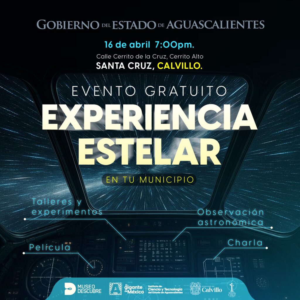 Si eres amante de la astronomía y te interesa descubrir cosas nuevas en el universo, no te pierdas la primera edición del programa “Experiencia Estelar”, este 16 de abril a partir de las 19:00 horas en la Santa Cruz, en el municipio de Calvillo.