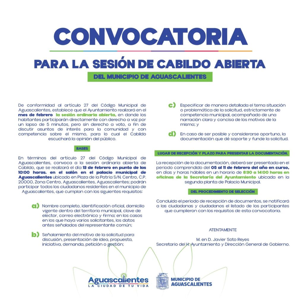 Con el objetivo de promover la participación ciudadana en las decisiones públicas y permitir que los habitantes del municipio de Aguascalientes compartan sus opiniones y propongan temas de interés para la ciudad capital, la Secretaría del H. Ayuntamiento y la Dirección General de Gobierno extienden una invitación a todas las personas interesadas en participar en la Sesión Ordinaria Abierta de Cabildo correspondiente al mes de febrero de 2025.