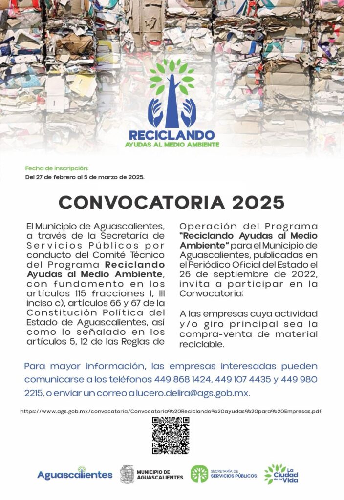 Podrán participar empresas con domicilio fiscal en Aguascalientes, cuya actividad principal sea la compra-venta de materiales reciclables. La convocatoria estará vigente del 27 de febrero al 05 de marzo de 2025, y los resultados se darán a conocer el 07 de marzo de 2025.