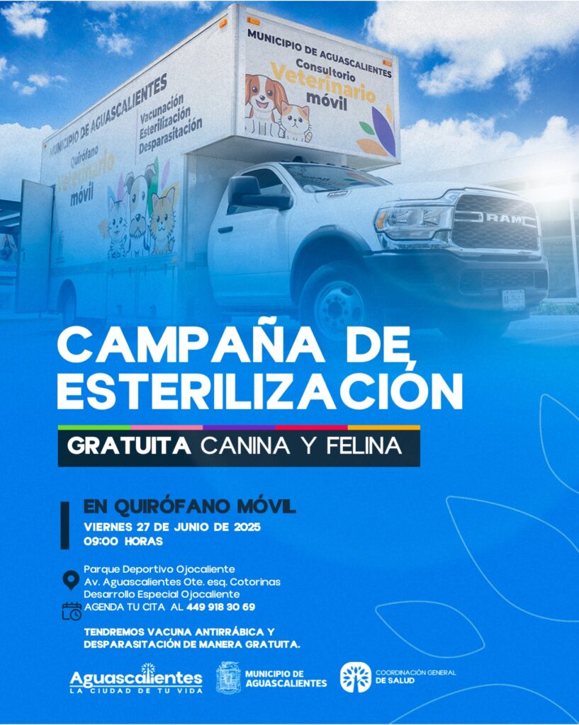 El próximo viernes 27 de junio se llevará a cabo una nueva jornada de esterilizaciones caninas y felinas, desparasitación y vacuna antirrábica, todas gratuitas, en el Parque Deportivo Ojocaliente, ubicado en Av. Aguascalientes Ote. esq. Calle Cotorinas, en el Desarrollo Especial Ojocaliente, a partir de las 9:00 de la mañana, como parte del cierre del curso de buenas prácticas de higiene, que actualmente se realiza en las Delegaciones Urbanas y Rurales.