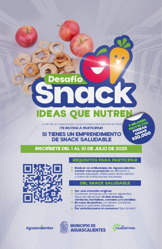 Con el propósito de fomentar una cultura de alimentación saludable, así como promover ideas creativas con potencial de emprendimiento, el Municipio de Aguascalientes, a través de la Secretaría de Economía Social y Turismo Municipal (Setum) y en colaboración con la Comisión Permanente de Salud, presentó la convocatoria del concurso “Desafío Snack: Ideas que nutren”, dirigida a estudiantes, emprendedores, chefs, nutriólogos y al público en general.