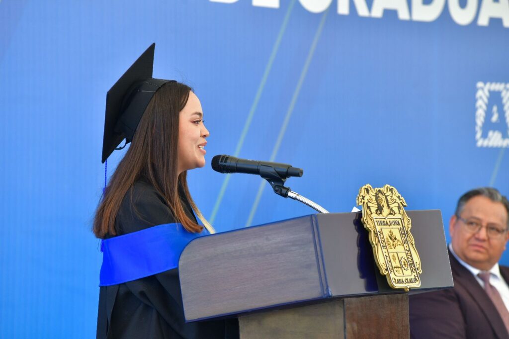 “Hoy llegamos a este día para celebrar nuestros sueños, estamos  aquí porque ustedes creyeron en nosotros aun cuando no lo hicimos; tenemos la certeza de que, gracias a la formación que recibimos, tendremos calidad internacional. Esta casa de estudios nos ha guiado con valores y principios, fomentando los talentos. Agradecemos a la gobernadora por siempre confiar en nosotros los jóvenes, que ya no somos el futuro del país, sino el presente”, subrayó la graduada.