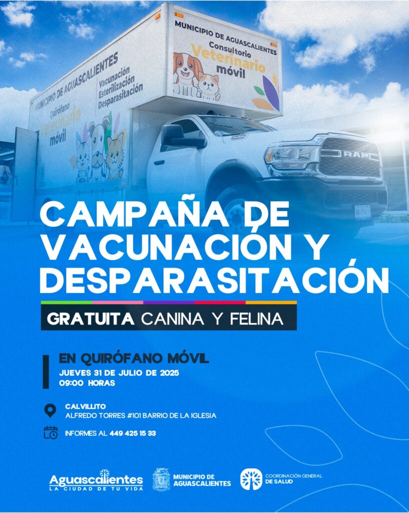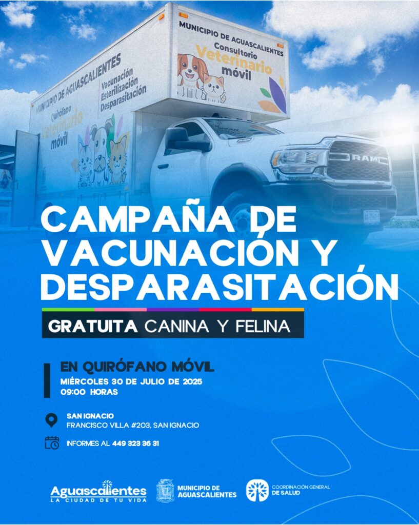 El Municipio de Aguascalientes, a través de la Coordinación General de Salud, llevará los próximos 30 y 31 de julio, el quirófano móvil a San Ignacio y la comunidad de Calvillito, respectivamente con una campaña de vacunación antirrábica y desparasitación.
