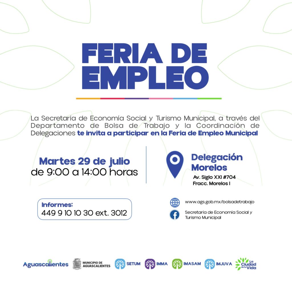 La Secretaría de Economía Social y Turismo Municipal, a través del Departamento de Bolsa de Trabajo, invita a la ciudadanía a participar en una nueva edición de la Feria de Empleo que se llevará a cabo el martes 29 de julio de 2025, en un horario de 9:00 a 14:00 horas en la Delegación Morelos, ubicada en Av. Siglo XXI #704, fraccionamiento Morelos I.