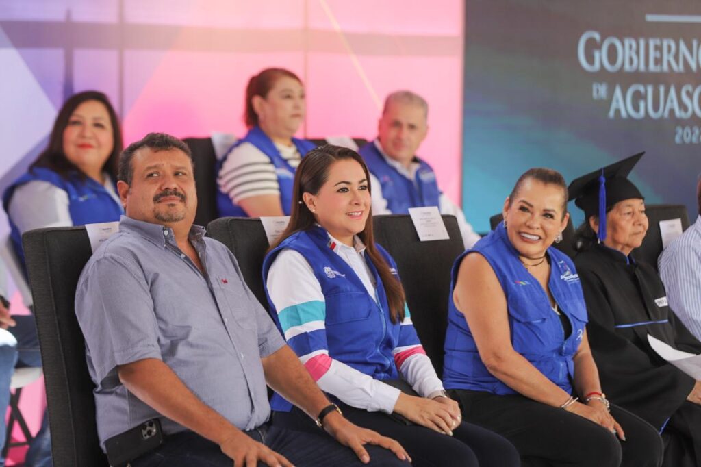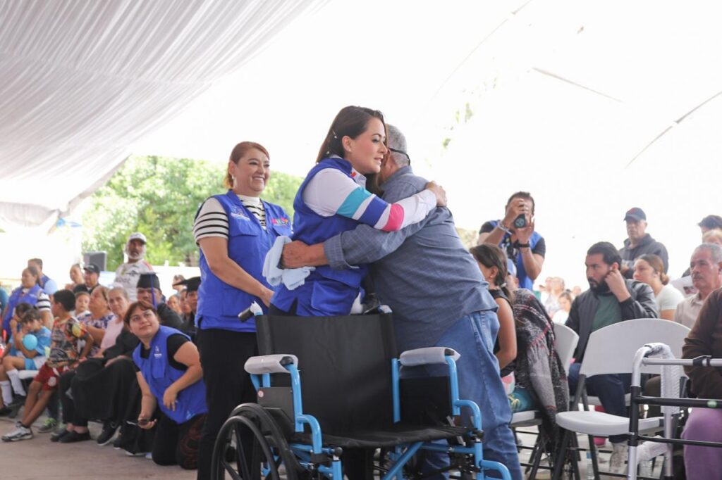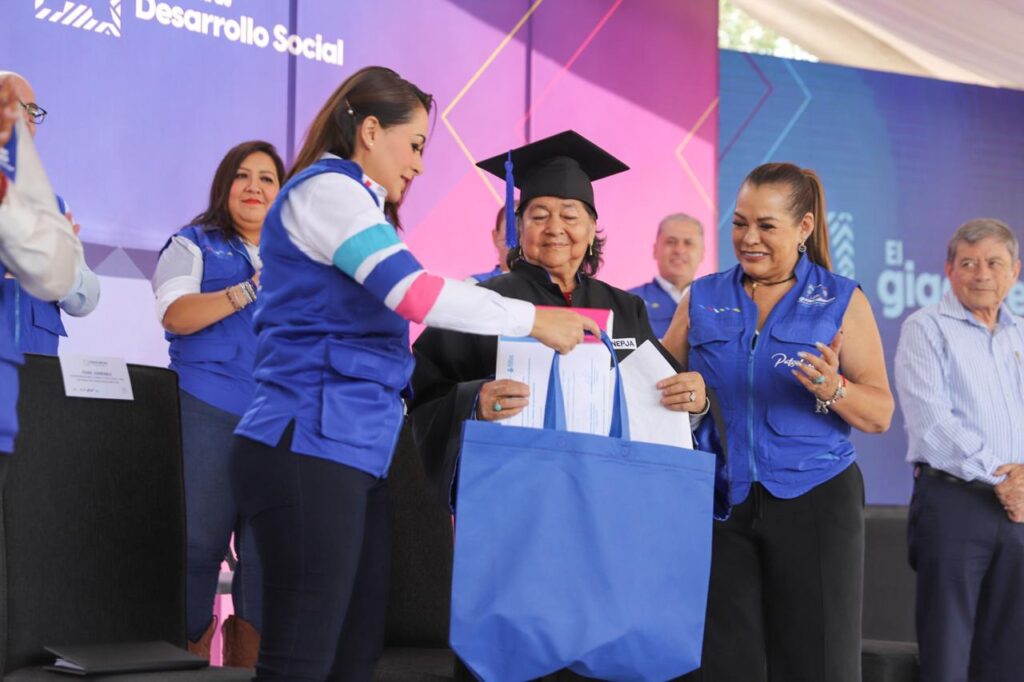 Durante el evento, Tere Jiménez y autoridades entregaron sillas de ruedas y andaderas, así como certificados de primaria y secundaria a personas mayores que concluyeron sus estudios de forma gratuita en el Instituto para la Educación de las Personas Jóvenes y Adultas de Aguascalientes (Inepja).