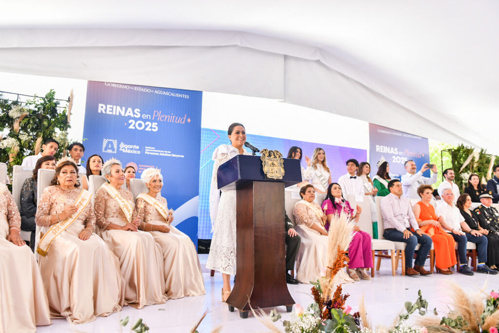 Posteriormente, en el mismo Jardín de San Marcos, la gobernadora presidió la ceremonia de coronación de las Reinas en Plenitud, organizada por el Instituto Aguascalentense de las Personas Adultas Mayores (IAPAM), donde se reconoció a las representantes de cada municipio.