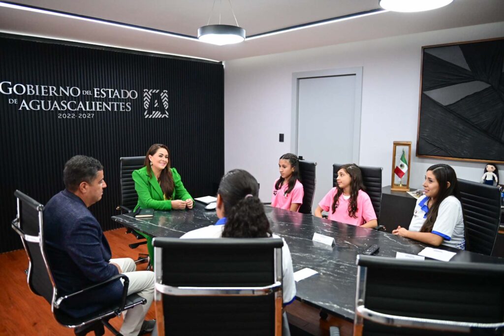 Durante el encuentro, la gobernadora felicitó a las atletas por su esfuerzo, disciplina y el orgullo que han dado a Aguascalientes con su destacada participación internacional. Reconoció también la labor de sus entrenadoras, Claudia Escobedo y Rubí Mejía.