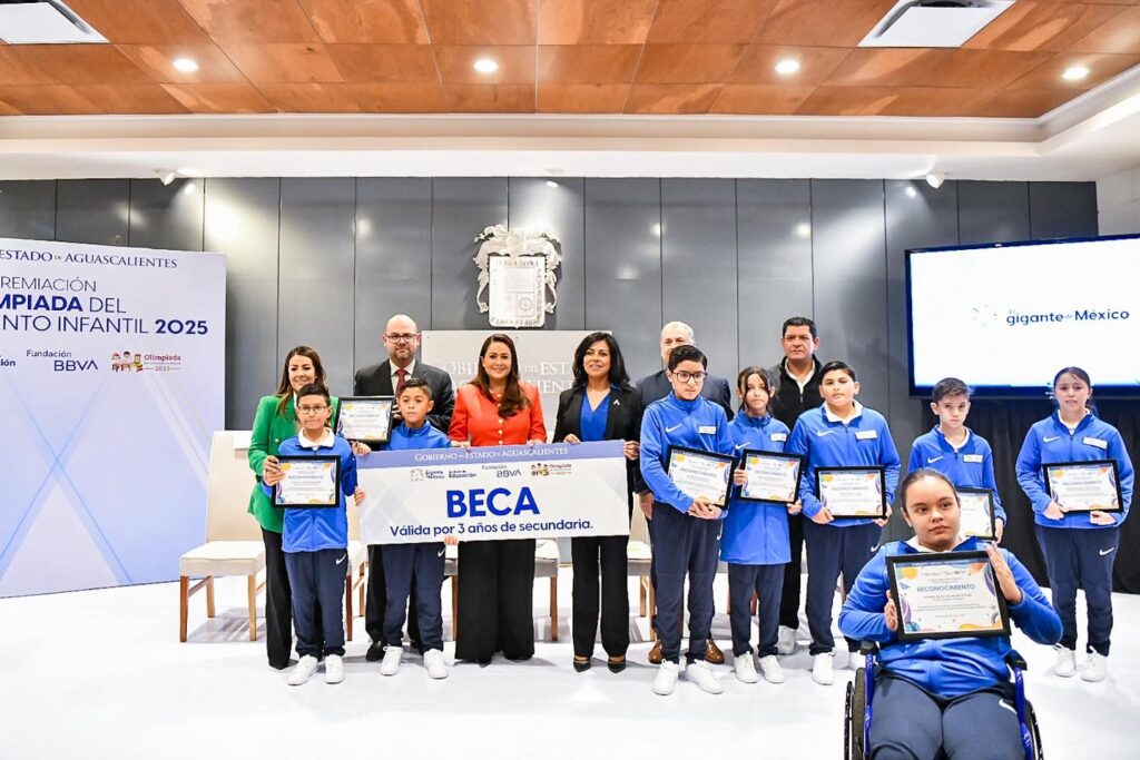 La gobernadora de Aguascalientes, Tere Jiménez, entregó becas a estudiantes que representarán a México en competencias internacionales en Estados Unidos y Singapur; así como apoyos a los ganadores de la Olimpiada del Conocimiento Infantil 2025.