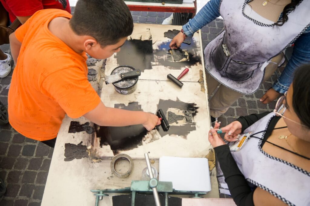 A lo largo de este espacio especialmente niñas y niños pueden participar en talleres como el ubicado en la estación J. Guadalupe Posada, en donde está la estatua viviente de este ilustre personaje aguascalentense y se enseña la técnica de grabado en el taller de arte gráfico.
